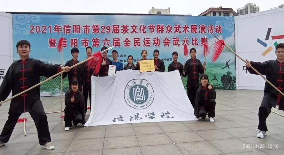举办比赛历史成绩:2021年4月3日受邀参加信阳市董家河镇非物质文化遗产汪家拳的揭幕式并进行表演。2021年4月27日至28日,我校汪家拳社团部分成员代表学校参加“信阳市第六届全民运动会——武术”比赛,教练员由公共体育教学部雷丹云担任。经过两天激烈角逐,我校代表队斩获“集体项目二等奖”。在单项比赛中:李炳坤、刘文婧两位同学分别斩获传统类汪家拳男子、女子青年组一等奖;刘柯江、朱闪闪两位同学分别斩获传统类汪家拳男子、女子青年组二等奖;刘文婧、李瑶、刘柯江、刘亚宁同学荣获传统类传统枪二等奖。2022年4月30日,与其他社团联合举办传统类联欢晚会。