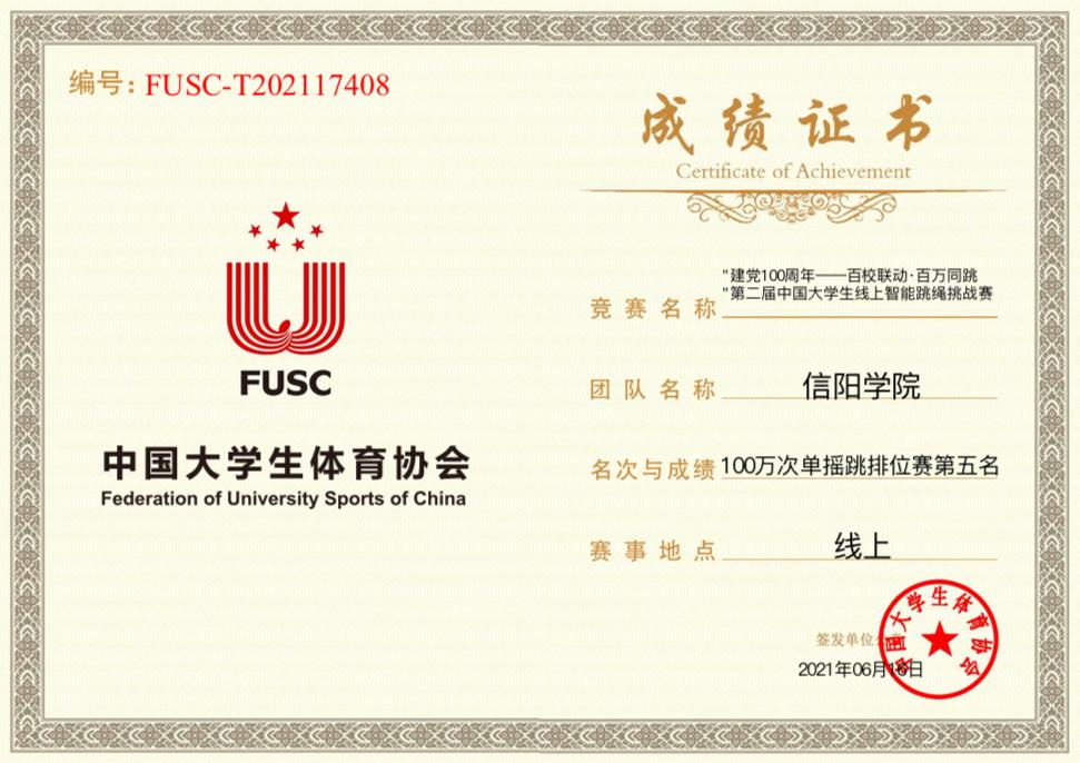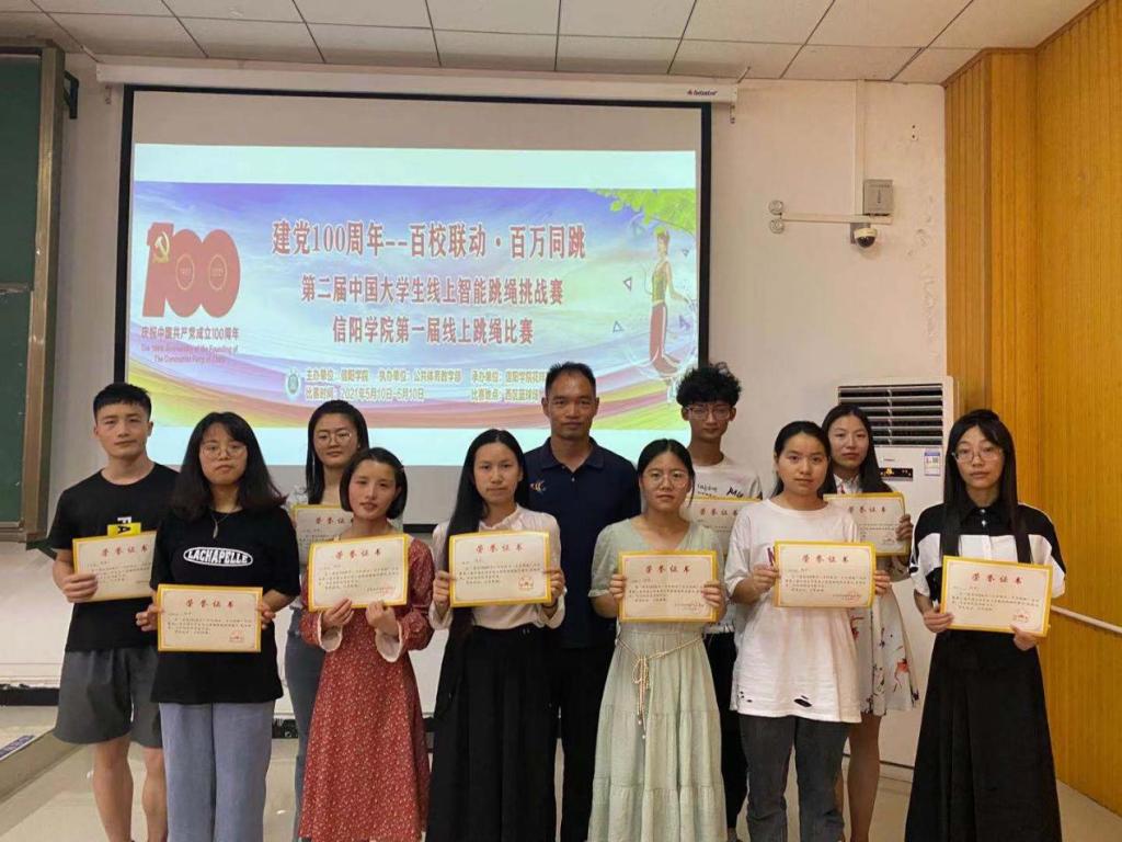 在本次挑战赛中信阳学院近200多名的学生经过不屈不挠的奋战,不断突破自己的极限,挑战自我,在不到11个小时的时间里完成了一百万次单摇跳的线上智能跳绳挑战赛,并且在近百所高校中抢先拿到了第五名的成绩。完成比赛的那一刻,所有人激动的心情都无法言喻,但在这成功的背后,所有人都付出了很大的热情与努力,正是有他们的艰辛付出才得以让比赛顺利进行。