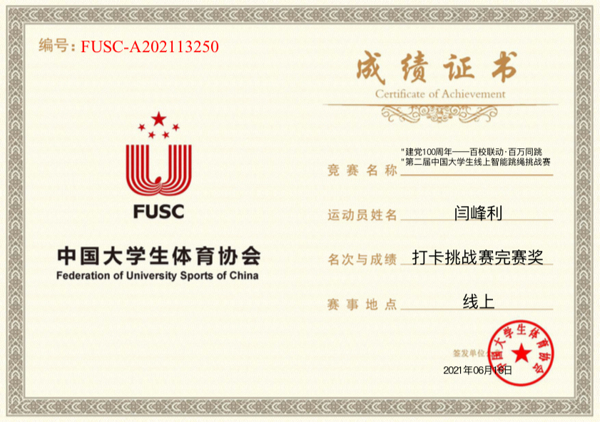 在打卡挑战赛中,我校以总积分980分排位68名,其中文学院高晶贡献300分,教育学院闫峰利贡献260,他们以连续30天跳绳每天跳绳800+个,分别获得打卡挑战赛完成奖。