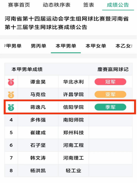 本次比赛系我校首次参加河南省运动会网球项目学生组比赛,就获得了如此佳绩,把信阳学院的网球名声成功地打入了河南省。彰显了我校学子不畏强敌,敢打敢拼的体育竞技精神,把信阳学院网球提升到了一个前所未有的高度。