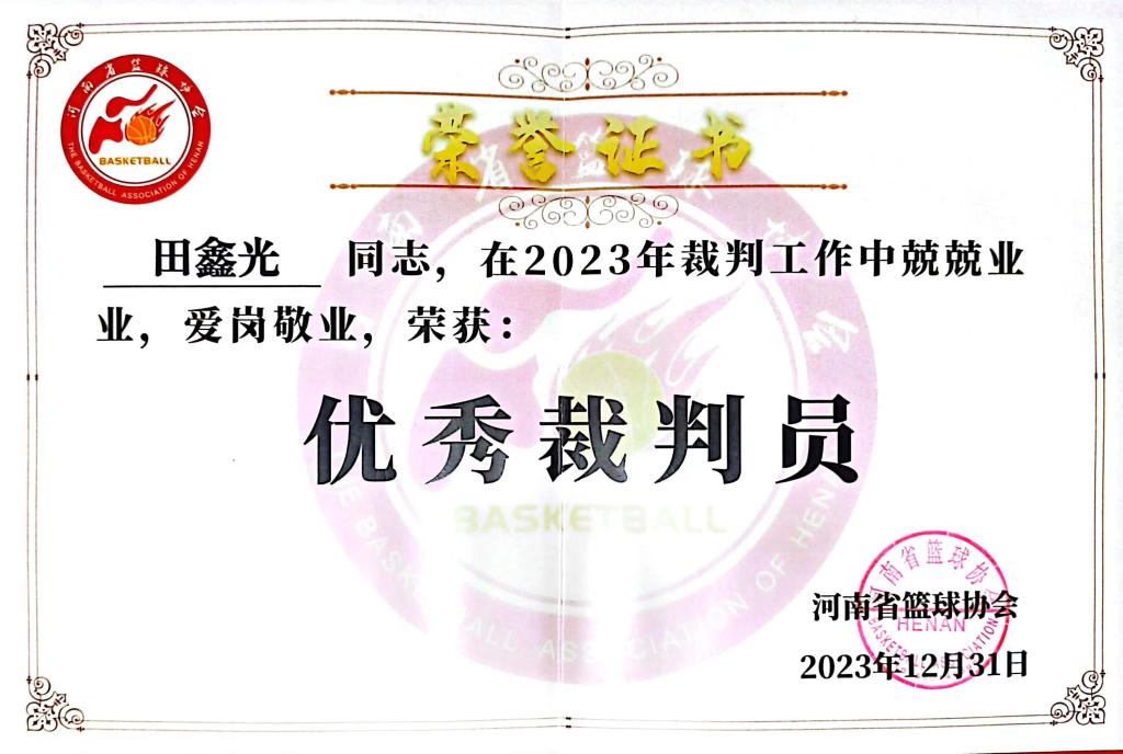 2023年12月30日,“2023年河南省篮球协会年终总结表彰大会暨理事会议”在河南省篮球协会训练基地召开。我校公共体育教学部田鑫光老师荣获2023年度优秀篮球裁判员称号。