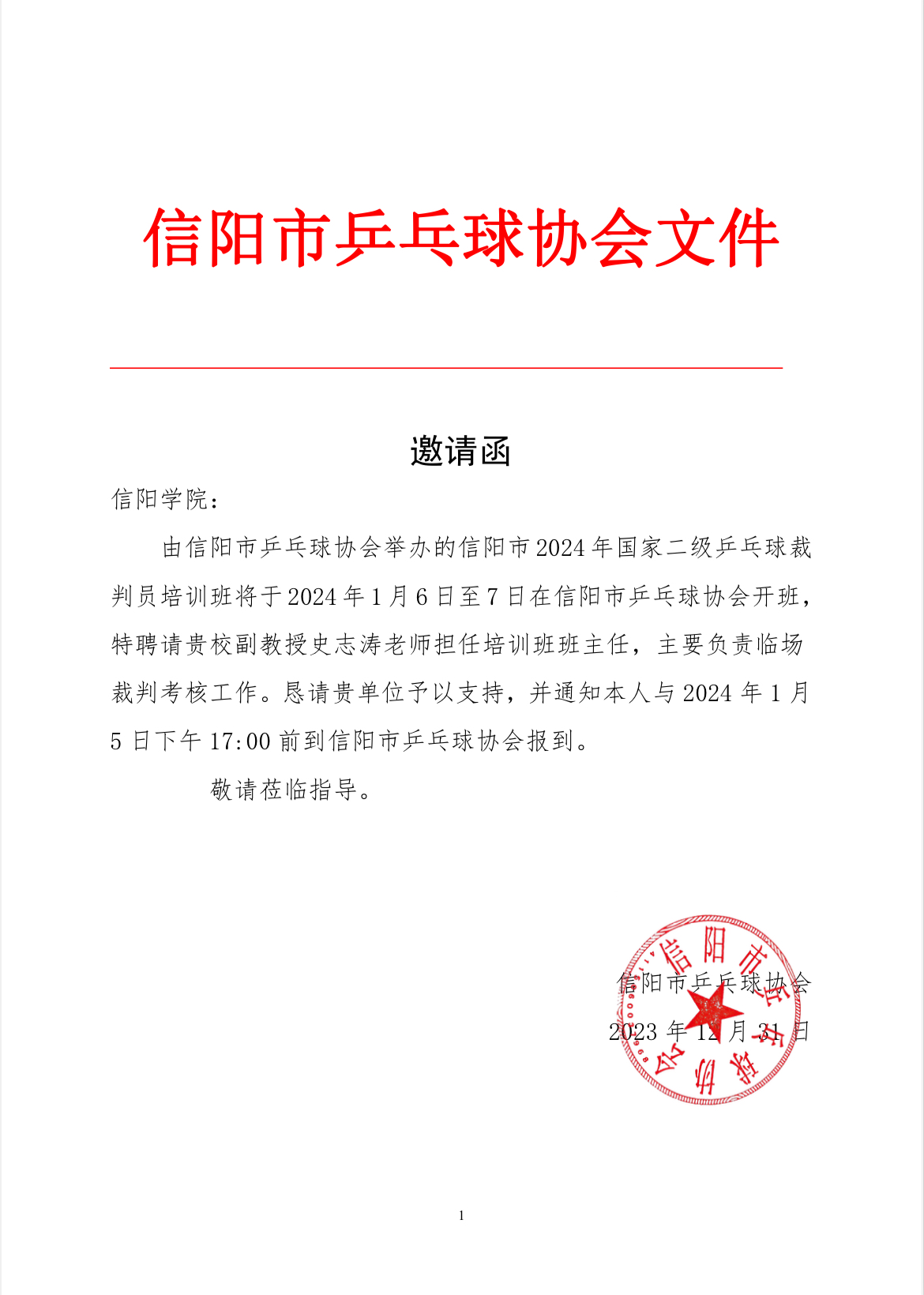 2024年1月6日—7日,信阳市2024年乒乓球国家二级裁判员培训班在信阳市成功举办。我校公共体育教学部教师史志涛受邀担任本次培班班主任,并高质量完成培训班各项任务,得到信阳市乒乓球协会赞誉和参会学员的一致好评。