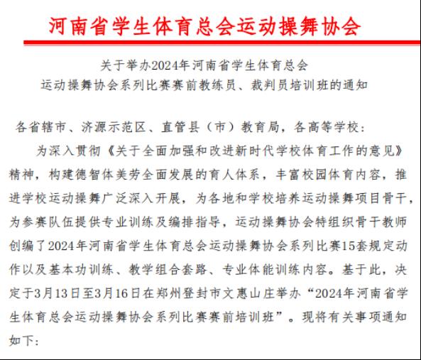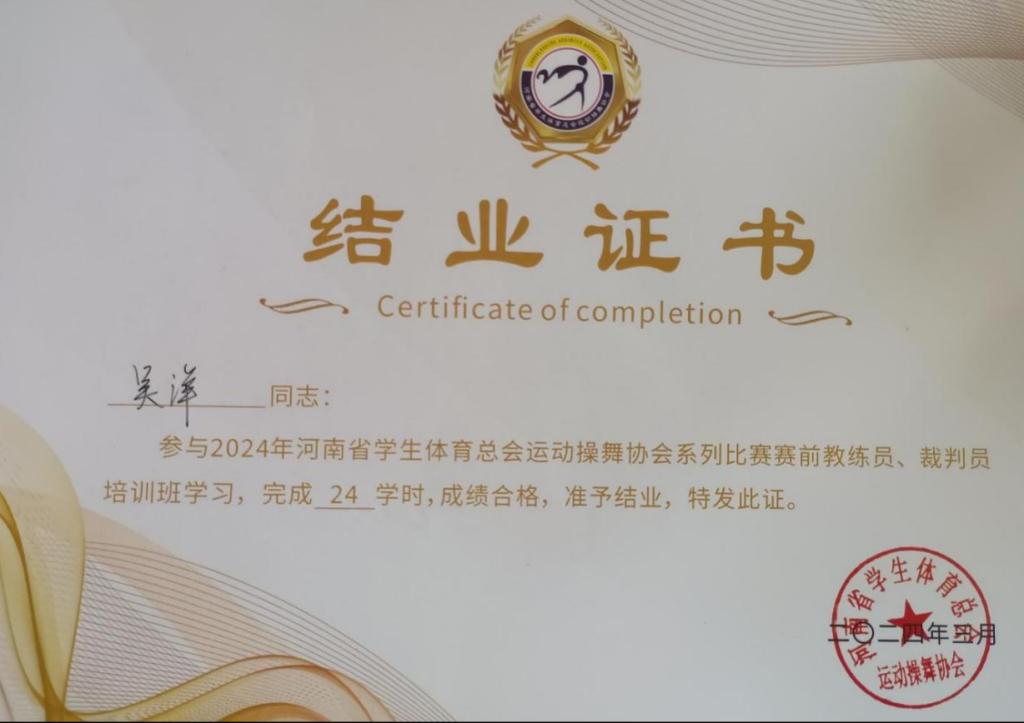3月13日至3月16日,2024年河南省学生体育总会运动操舞协会系列比赛赛前培训班在郑州登封市文惠山庄举办。我校公共体育教学部教师吴洋参加本次培训活动。