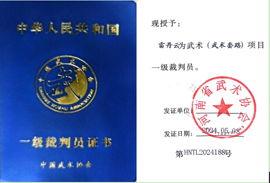 4月30日至5月3日,2024年河南省传统武术裁判员培训班在郑州登封市嵩御山庄举办。本次活动是我省传统武术裁判员晋升一级培训和考核。我校公共体育教学部教师雷丹云完成既定的培训内容和考核,获得武术(武术套路)项目一级裁判员。