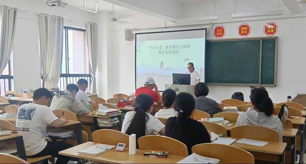 活动分两部分,首先路明云老师针对“1+1+2教学模式下体育教学方法探讨”教研主题,把握重点从科研探索的视角结合自身多年教学经验,针对体育教学过程中的常用教学方法进行了分类总结,分别从“以语言传递信息为主的教学方法”、“以直接感知为主的教学方法”、“以身体练习为主的教学方法”、“以情景和竞赛活动为主的教学方法”、“以探究活动为主的教学方法”等进行阐述。