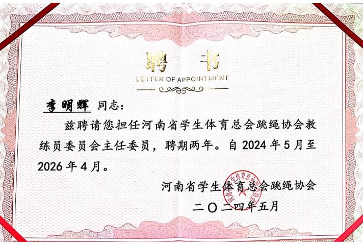 我校青年体育教师李明辉经过不断努力在全国赛场多次担任裁判员以及受聘成为全国跳绳培训导师,同时指导信阳学院花样跳绳社团及带领信阳学院跳绳队的成绩斐然。为此受邀担任河南省学生体育总会跳绳协会教练委员会主任委员,这不仅是对李明辉老师的个人专业素养和综合能力认可,更是对我校跳绳队取得优异成绩的认可。