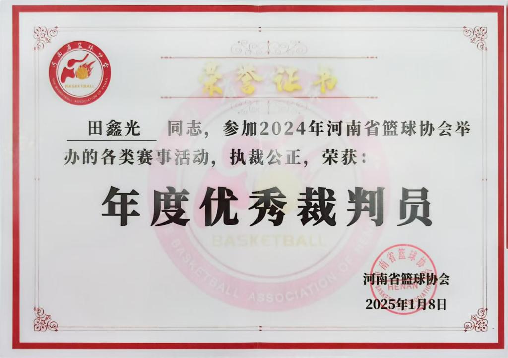 我校公共体育教育部田鑫光老师代表信阳学院参加2025年1月16日,“2024年河南省篮球协会年终总结表彰大会”在河南省篮球协会训练基地召开。我校公共体育教学部田鑫光老师荣获2024年度优秀篮球裁判员称号。