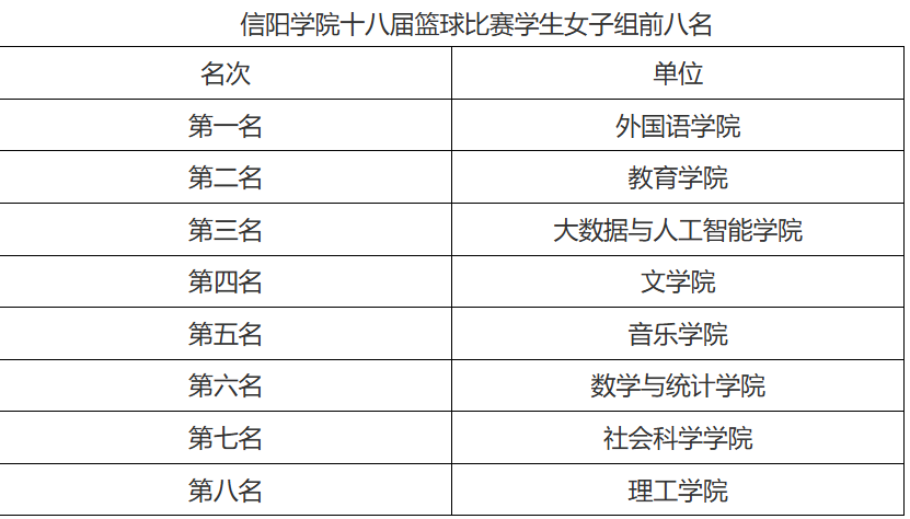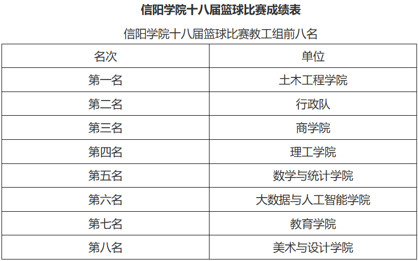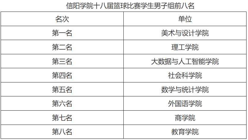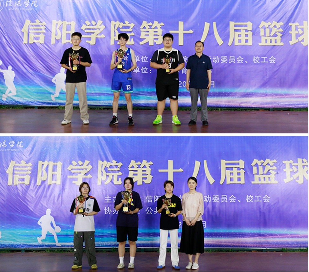5月8日至5月20日,信阳学院第十八届篮球比赛成功举办。本次赛事由信阳学院工会委员会主办,信阳学院公共体育教学部承办。副校长、体育工作委员会主任王志华,副校长、工会主席王强分别出席了开幕式和闭幕式,王强在开幕式上致辞,王志华在闭幕式上为获奖代表颁奖。教务处、人事处、宣传部、学工部、公共体育教学部及各二级学院负责人参加了开幕式和闭幕式。