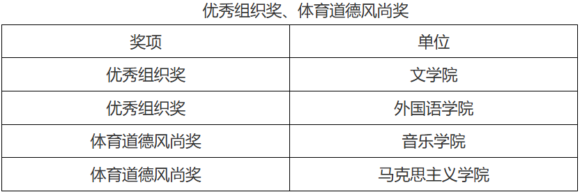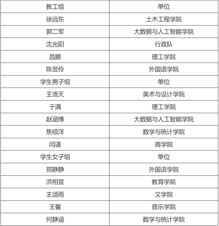 本届比赛设有教工组、学生男子组、学生女子组,有14支教工队伍和22支学生队伍共460余名选手参加比赛。赛场上,球员们身姿矫健,全力投入每一次进攻与防守。他们快速突破,精准投射三分,默契的配合、激烈的对抗,展现出高超的球技和顽强拼搏的体育精神。一次次精彩的进球,引得现场观众欢呼声、呐喊声此起彼伏,掌声雷动。经过数轮激烈的比拼,土木工程学院、行政队、商学院分获教工组前三名;美术与设计学院、理工学院、大数据与人工智能学院获得学生男子组前三名;外国语学院、教育学院、大数据与人工智能学院获得学生女子组前三名。文学院和外国语学院获得优秀组织奖,音乐学院和马克思主义学院获得体育道德风尚奖。土木工程学院徐远东、美术与设计学院王浩天、外国语学院郑静静等师生获优秀运动员称号。