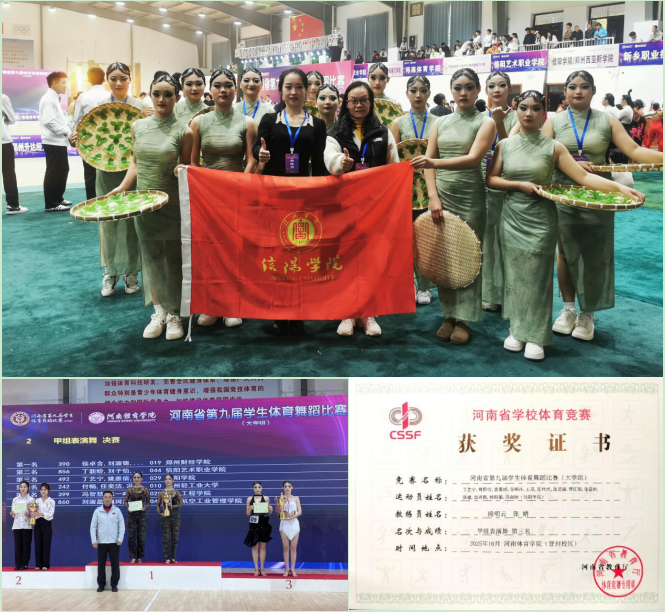 2025年10月17日-18日,由河南省教育厅和河南省体育局主办的河南省第九届学生体育舞蹈比赛(大学组)在河南体育学院登封校区圆满落幕,在为期两天的激烈角逐中,信阳学院体育舞蹈队最终斩获甲组表演舞第三名。