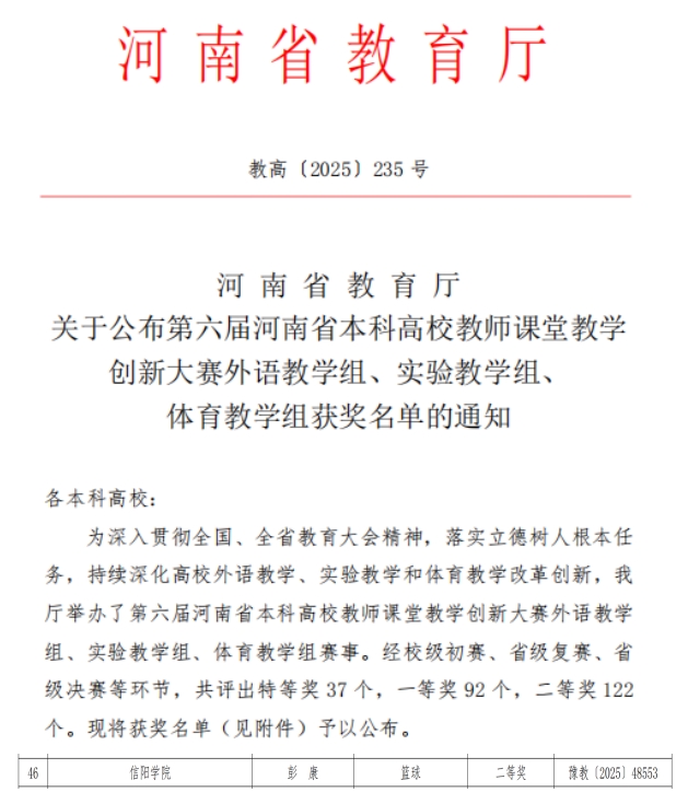 为深入贯彻全国、全省教育大会精神,落实立德树人根本任务,持续深化高校外语教学、实验教学和体育教学改革创新,河南省教育厅举办了第六届河南省本科高校教师课堂教学创新大赛外语教学组、实验教学组、体育教学组赛事。经校级初赛、省级复赛、省级决赛等环节,最终评出各类奖项。